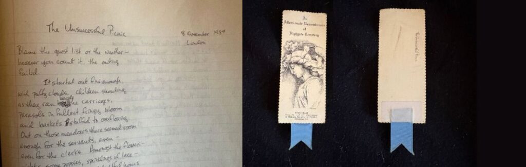 On the back of the bookmark (also pictured) I had written “The Unsuccessful Picnic.” Memory is, of course, a faulty tool, but I seem to recall scribbling this on the Tube ride back from Highgate to the Queen Mary College student high rise in South Woodford: the inspiration had come to me during the tour of the cemetery (still one of the best tours I’ve ever taken), when the guide showed us General Loftus Otway’s tomb and told the spurious tale of its part in the origins of Bram Stoker’s “Dracula.”